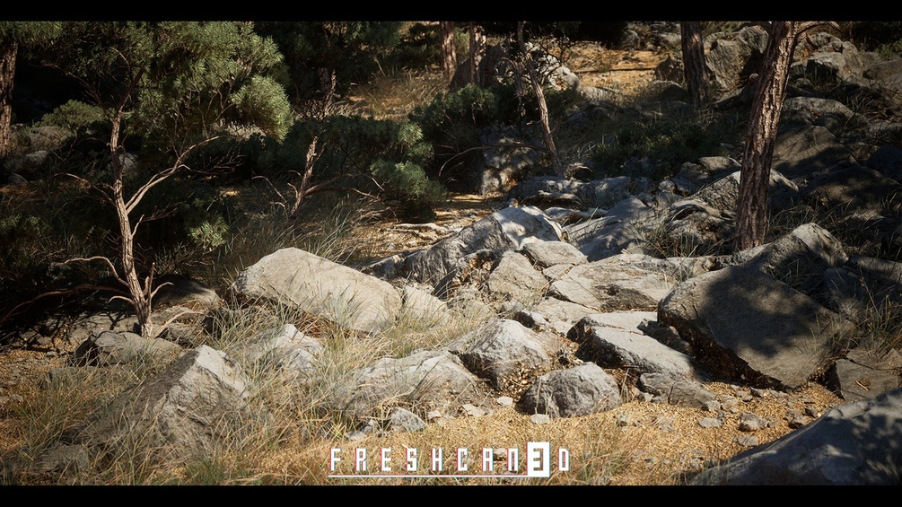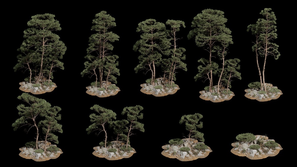 - Photoscan Assets ( 12 Pine Trees, 17 Rocks, and Assemblies, 40 Ground Plants, 6 Shrub Trees.)